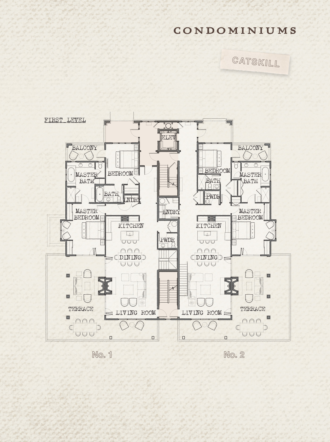 The manor house architecture of these varied units offers soaring spaces with high ceilings, double-height living areas, and incredible views. Elevators from the underground parking and storage area conveniently whisk you to your individual unit. Ranging from 2 to 4 bedrooms with single- and multiple-level options, many of the terraces offer walk-out spaces with private areas for outdoor living and dining. Upper-level units feature dormer windows, terraces and decks flooding each space with natural light.